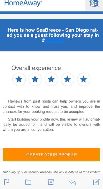 I would say I fell out of the funnel at the Evaluation phase, although I did notice their attempt to make this urgent under the CTA button. In this case, I didn't take the action because I didn't feel like the benefits (having a 5-star rating) outweighed the costs (time to create a profile). For what it's worth, I did actually take the action they wanted me to - click on the link to create a profile. But I couldn't complete it because they (arbitrarily?) invalidated the link after a day or two - perhaps an example where creating urgency failed to help them achieve the objective of having me create a profile so I'd be more likely to think about using HomeAway the next time we need to rent a place on vacation.