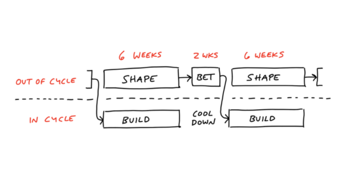 Unlike Agile processes where the team breaks a large body of work down into smaller sprint-sized chunks and starts to build them, Basecamp's process instead holds fixed the time to release a chunk of work to customers and focuses on "shaping" work into that time period. Big bodies of work take 6 weeks for a small team (1 designer and 2 engineers), while smaller ones take 2 weeks with the same size team (in that case, the team takes on 3-5 smaller bets to fill the 6-week cycle).