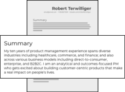 Limit your bullets to five if possible, and focus on outcomes you've achieved. Also, avoid including generic work descriptions (e.g., ran thrice-weekly standups and curated the backlog) as a PM's calling card should be focused on outcomes, not work effort..png?width=240&name=PM%20resume%20blog%20post%20(3).png)