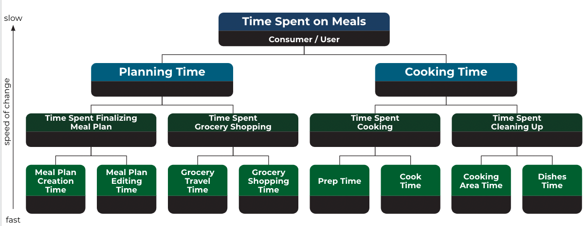 To decide which one to choose, we of course turned to customers. During interviews, customers mentioned that their main frustration with cooking at home was how much time it takes. In general, no matter what app or cookbook they used to decide what to make, they were pretty happy with the meals. And the cost didn't seem to be a huge concern - it was always cheaper than eating out. So we decided that the outcome was to reduce the time spent getting the meal on the table. That breaks out into some subcomponents, like the time spent planning, cooking and cleaning up. We arrived at this pyramid: